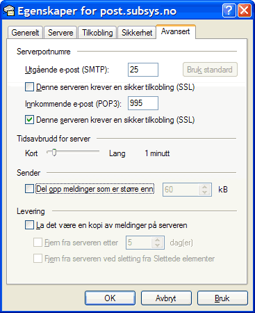 Du vil da få opp et bilde tilsvarende det nedenfor. Kontroller at det er krysset av på SSL-kryptering for innkommende e-postserver. Det skal ikke krysses av på utgående.