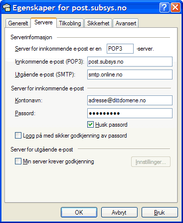 - Utgående e-postserver må byttes til den som brukes av din Internett-leverandør (Telenor, Tiscale, Tele2 m.fl.). I eksempelet er serveren til Telenor Online kunder brukt.